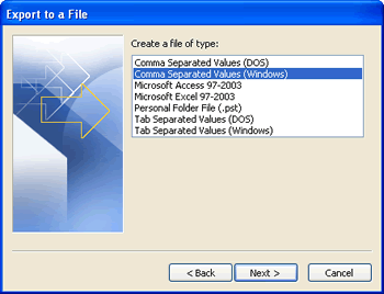 Have you ever wondered how to get contacts out of Microsoft Outlook in order to import them into another application like QuickBooks or other contact management applications? Microsoft Outlook has a built-in feature that makes this a snap by exporting all of your contacts from a specified Contacts folder to a CSV file. The CSV (Comma Separated Value) file format has long been an industry standard for importing and exporting data to and from database applications and spreadsheets; and most applications provide a facility to import data, like contacts, using this file format.